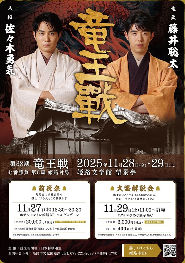 「第38期竜王戦七番勝負第5局姫路対局」の開催に合わせて、関連イベントとして前夜祭及び大盤解説会を開催します。◆前夜祭姫...