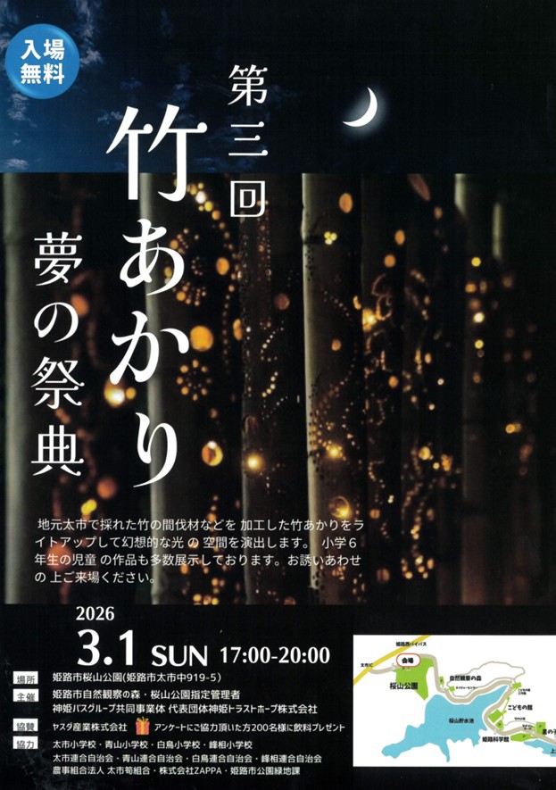 地元太市で採れた竹の間伐材などを加工した竹あかりをライトアップ。幻想的な光の空間を演出します。小学6年生の児童の作品も...