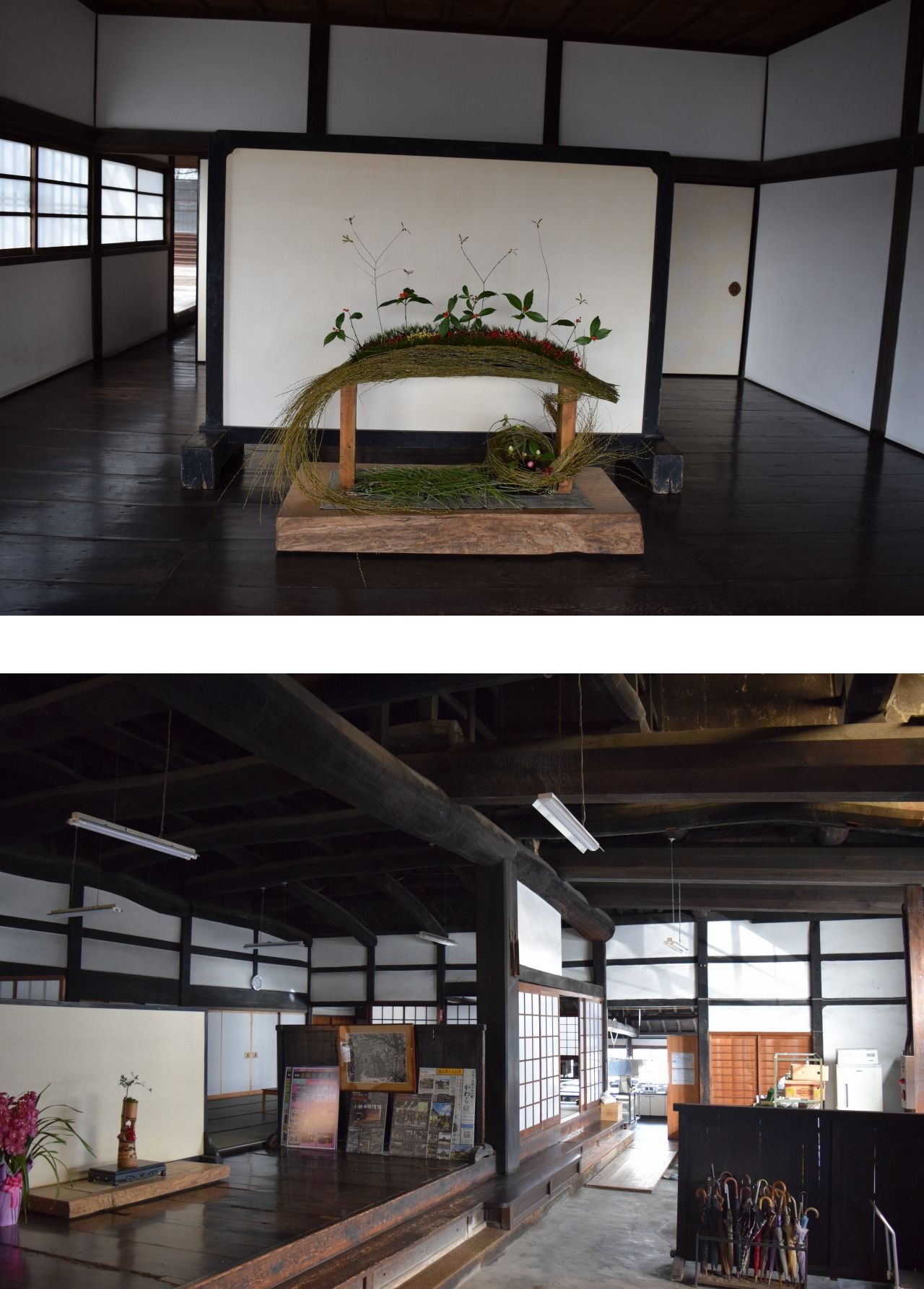 庫裏は寺院の台所兼食堂だが、本徳寺の庫裏は県下でも最大規模を誇っており、たたきの土間とそれに続く49畳の部屋に4室の座敷を付けている。40cm角の2本の心柱で支える大きな吹き抜け構造になっており、黒光りする柱と梁の絶妙の組み合わせが見事で、こちらもぜひ映像に取り込みたいところ。昨年、ハリウッド映画の撮影が行われたのも記憶に新しい。