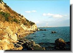 2002年7月号でも簡単に紹介したが、姫路市の東南部の海岸線に「小赤壁」と呼ばれる景勝地がある。海に迫り出した山に沿って奇岩、奇石が高さ50m、長さ800mにわたって断崖をなし、江戸末期に姫路藩の名家老・河合寸翁が設立した仁寿山校を訪れた頼山陽が、その景観が中国揚子江の赤壁を彷彿させるところから命名したと伝えられている。その断崖の下を磯伝いに遊歩道が続いている。遊歩道と言っても、足場の悪い所にコンクリートを流し込み、足場の良い所は砂浜や岩礁の上を伝い歩くという素朴なものだが、整備されてから30年近くもたっているせいか一部は崩落し、人工の遊歩道という感じは薄れてきている。