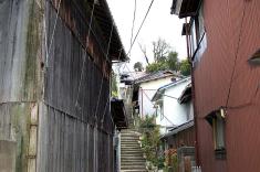 泊山の山上にある海岳寺にも惹かれるものがある。行基の開創と伝えられる古刹で、長い石段を見上げると視線の先に鐘楼門が見え、趣のあるアングル。鉄製の手すりが備え付けられているので時代を遡らせるわけにはいかないが、たとえば古い港町の寺に墓参に出かける女性の後姿を捉えたいという誘惑にもかられる。寺の脇には地元の人たちが丹精している野菜畑が広がっており、遙かに海も。いかにも瀬戸内海の寺院らしい雰囲気である。