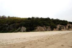 一方の福泊港は泊山の西に位置する小さな漁港で、西側に奇岩・巨岩が織りなす断崖が海に迫る名勝「小赤壁」があるが、今回紹介したいのは港の東側にある福泊海浜公園。キャンプ場とマリーンベルトと呼ばれる広い砂浜からなり、家族連れやウインドサーファーたちで賑わっているが、この砂浜も魅力的。県の整備事業によって誕生した砂浜で、当初はいかにも人工的な匂いが鼻についていたが、歳月というのはありがたく、今ではすっかり周囲の景観と馴染み、人工の浜辺とは思えないほど。北側が山で、建造物もほとんどないので、うまくアングルを切り取れば島の浜辺そのもの。奥行きもあるので、時代劇の格闘シーン、たとえば巌流島の決闘シーンなどにも取り込めそう。これまた姫路市内のロケ地の穴場と言えそうである。