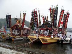 海上の安全と五穀豊穰を祈願して奉納される神事は25日の昼宮で龍頭の檀尻船(2隻の船を合わせ、絢爛豪華な装飾をほどこし、舞台を備えた船)で渡御する威勢のいいものです。