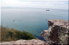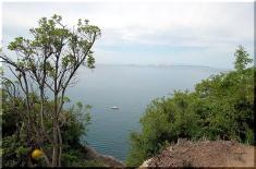 登りきると神社があり、眼前に瀬戸の海がパノラマのように開ける。どこまでも青い海と家島群島や淡路島などの島影が見え、タンカーや貨物船がゆったりと海を横切り、手前左右には煙突やタンクが林立する工場群が広がっている。瀬戸内海のビューポイントとしては兵庫県内でも屈指の場所で、これだけでも充分絵になる。加えて足元の雑草の下は見下ろすのが怖いくらいの断崖絶壁。サスペンスドラマのワンシーンが目に浮かぶようである。
