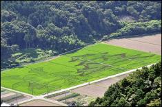 田宴アートとは、種類の異なる稲の穂を使って、田んぼに絵を描き出すものです。