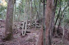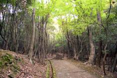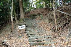 本丸跡からは上ってきた大手道を通らず、西に向かって下っていくと、大きな石灯籠が立つ一画に出る。ここから麓に向かっては、両側に鬱蒼とした木立が続く“昼なお暗し”の形容がぴったりの道が続き、番所跡や石の蹲(つくば)いが残る侍屋敷跡などがある。いずれも脇坂時代のものだが、時代劇ドラマに充分耐えうる趣を醸し出している。