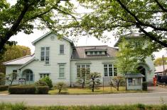 木造瓦葺き一部2階建て、中央部に屋根窓を持つ主屋、西側に方形の塔屋(玄関塔)を従えた洋館で、下見板張りの外壁はパステル調のブルーで統一。主玄関のアーチ状のひさしと華麗な鉄格子をはめた扉、アールを描く通用口に見られるイオニア風の柱など、意匠にも凝っており、明治の名建築の名にふさわしい美しさと品格を醸し出している。その上、前面が道路、さらにその手前は樹木の植わった公園(緩衝地)になっており、「引き」に余裕があるので全景をうまく捉えることができる。