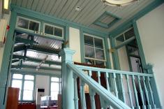 建物内部もまたすごい。塩務局時代そのままの木枠の受付窓口、天井にメダイヨン(円形浮彫)が施された1階の旧事務所、玄関ホールの上にあるアーチや手すりが施された2階ギャラリー、木製の手すりにアールヌーボー風の装飾が施された廻り階段、2階天井の屋根材を支えるハンマービーム、縦長の木枠の上げ下げ窓など、すべてが優美さにあふれている。
