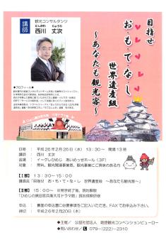 大河ドラマ効果や翌年の姫路城グランドオープンにより、国内外から激増する観光客へのおもてなしについて、業界のスペシャリストである、西川丈次氏を講師に迎え、自らの実体験・他都市の成功事例等を交えてご講演いただきます。是非とも皆様もご参加ください。