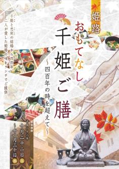 秋の行楽シーズンに向けて、食を通して市民や観光客の皆様のおもてなしを図るため、市内の飲食店の協力を得て「おもてなし千姫ご膳〓四百年の時を超えて〓」を開催。今年は千姫と本多忠刻が結婚されてから400周年の節目に因み各店舗が趣向を凝らした料理をご提供します。