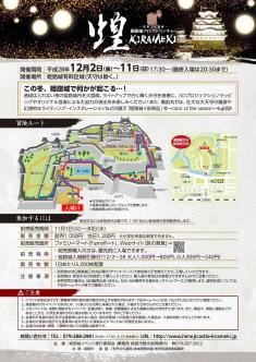 夜の姫路城を周遊する姫路城での光イベントを開催。三国堀、西の丸、お菊井戸など姫路城内の各スポットでプロジェクションマッピングなどの手法を使って、歴史上・姫路城ゆかりの人物、400年の歴史等、鮮やかな映像、迫力ある音響による演出で姫路城内を冒険。