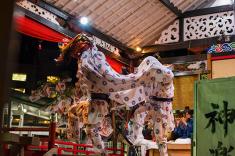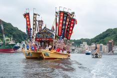 豪華絢爛に飾られた檀尻船2隻が海上を航海する姿は圧巻です。また、船内では笛や太鼓等の音頭に合わせ獅子や踊子が演舞します。