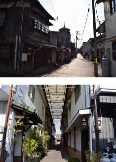 橋本町商店街を抜けるとカラー舗装をした「あぼし一番街」。かつての本町通りで、シャッターを下ろした商店と格子構えの町家が混在。龍野藩の旧大庄屋宅「加藤家」も残るが、むしろ面白いのは本町通りから外れた裏通りの道筋。飲食店街の面影を残すアーケードが架かる狭い路地や、二階の窓に腰掛け縁が出張る古い民家、屋根に物干し場を設けた格子窓の家、相撲場のある古い神社など、まるで松竹大船の映画にも出てきそうな雰囲気が残っているのである。