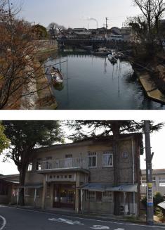 本町通りを西に向かうと、旧丸亀藩領だった興浜。「山本家住宅」など名士や旧家の家屋敷が多かった所で、「丸亀藩陣屋門跡」も残るが、山本家の斜め前にある古い店構えの仕出し屋兼魚屋さんやガラス戸の提灯屋さん、蔦が絡まる網干商工会館にも味わいがある。