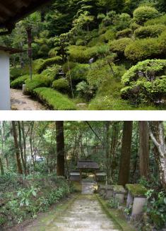 山門から本堂に至る苔むした石段も魅力的だし、山裾から続く参道の両側にはヒノキやスギの大木がそびえ、その合間に青々としたモミジの葉が顔を覗かせている。紅葉の頃はさぞ美しいに違いなく、アスファルトの道だが土舗装すれば武士や商人などが行きかう峠道に変身させることができるだろう。