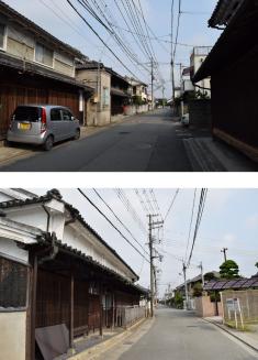 その御着の宿は、今もJR御着駅から国道2号の一本南、天川橋を渡った旧西国街道の道筋に面影を残している。ここ20年ほどで新しく建て替えられた家が増えたが、それでも漆喰壁に虫籠窓、格子戸といった往時を偲ばせる町家も残っており、町並みの間を旧街道が所々で味のある曲線を描きながら伸びている。