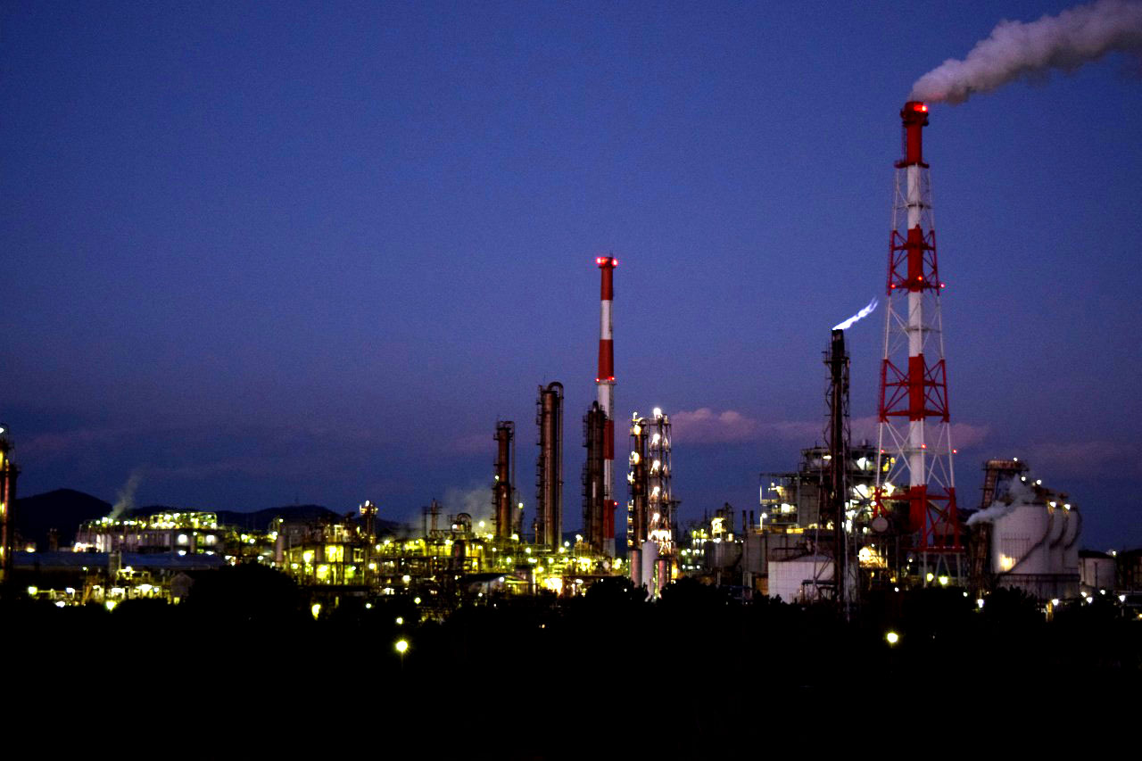 夜空を引き裂いて高く伸びる煙突と、複雑な構造を見せて縦横に連なるプラント群の配管など、ライトに照らされて白煙をなびかせる夜の工場はまさに迫力満点で、今にも熱い鼓動が聞こえてきそうな気がする。