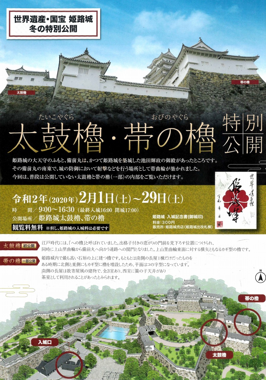 世界遺産・国宝 姫路城の特別公開として、2020年2月1日(土)〓29日(土)の期間に太鼓櫓と帯の櫓が特別公開されます。