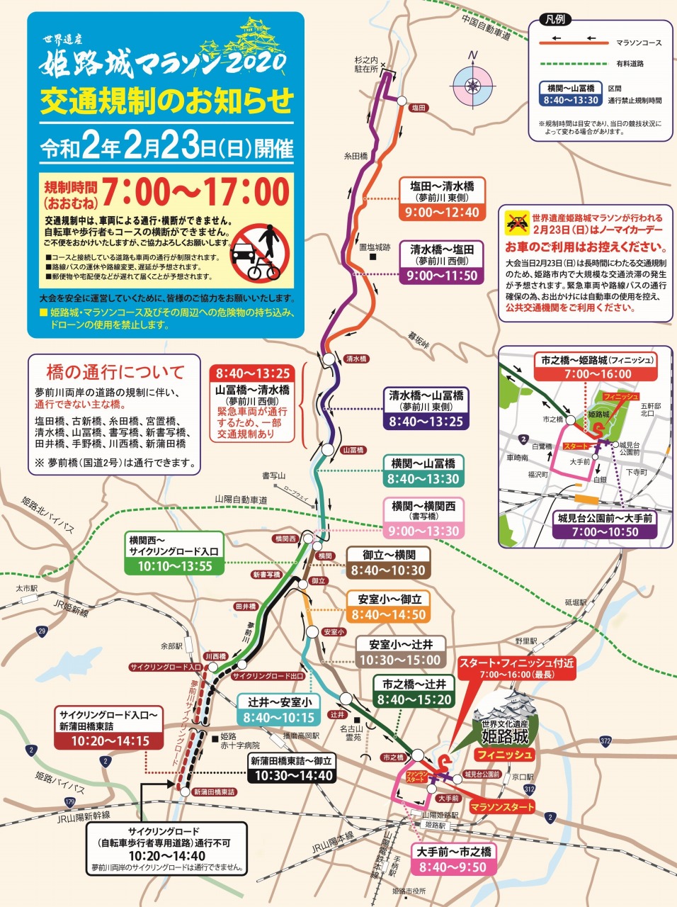 | 【交通規制】 | 大会当日は7時〓17時の間を目安に、姫路城周辺、コース周辺で交通規制が行われますので、自動車の使用はできる限り控えて頂きますようお願いします。 |