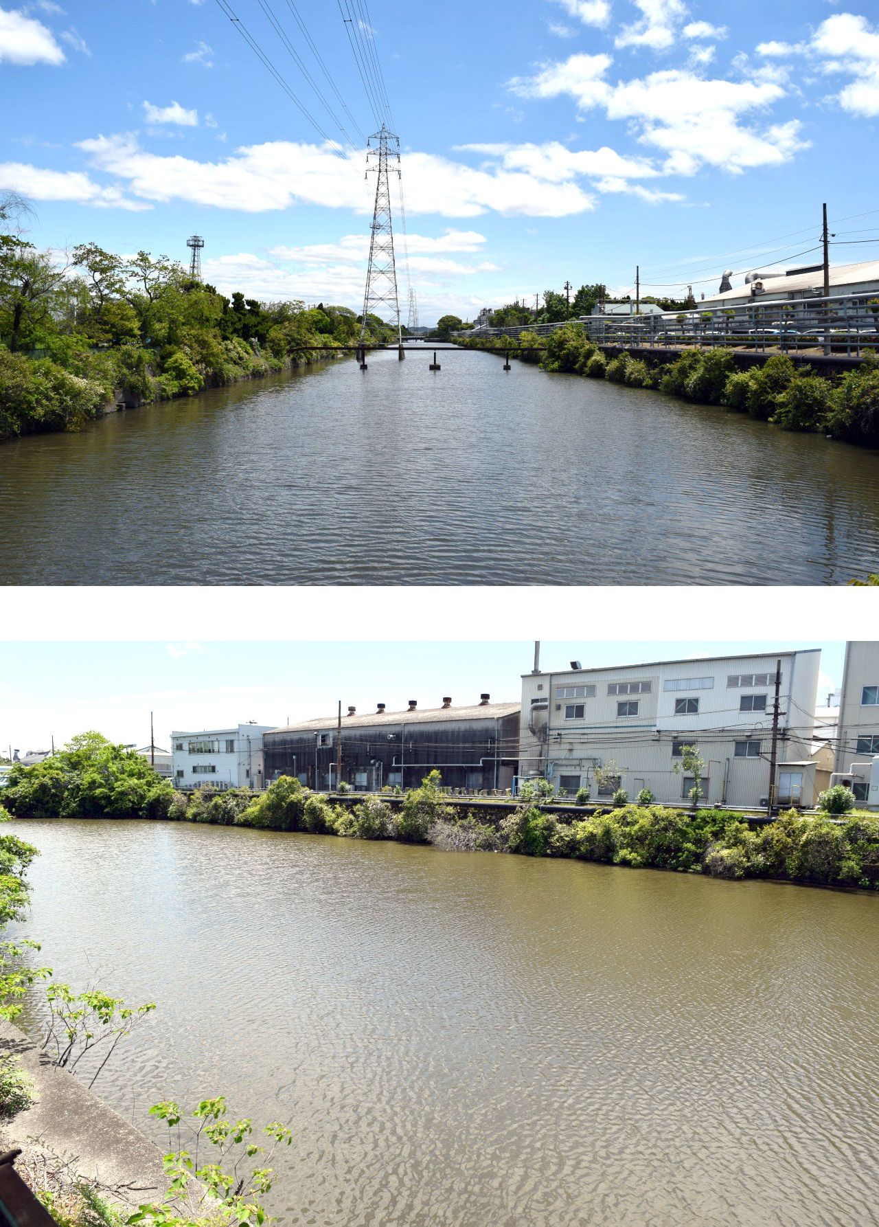 建設が進められた当時に、工場の北側に広がっていた水田地帯の用排水を図るために設けられた排水路で、水田が見られなくなった今は、東の夢前川と西の汐入川の間を結んで工場の製品や資材を船で運ぶ「運河」のようにしか見えない。
