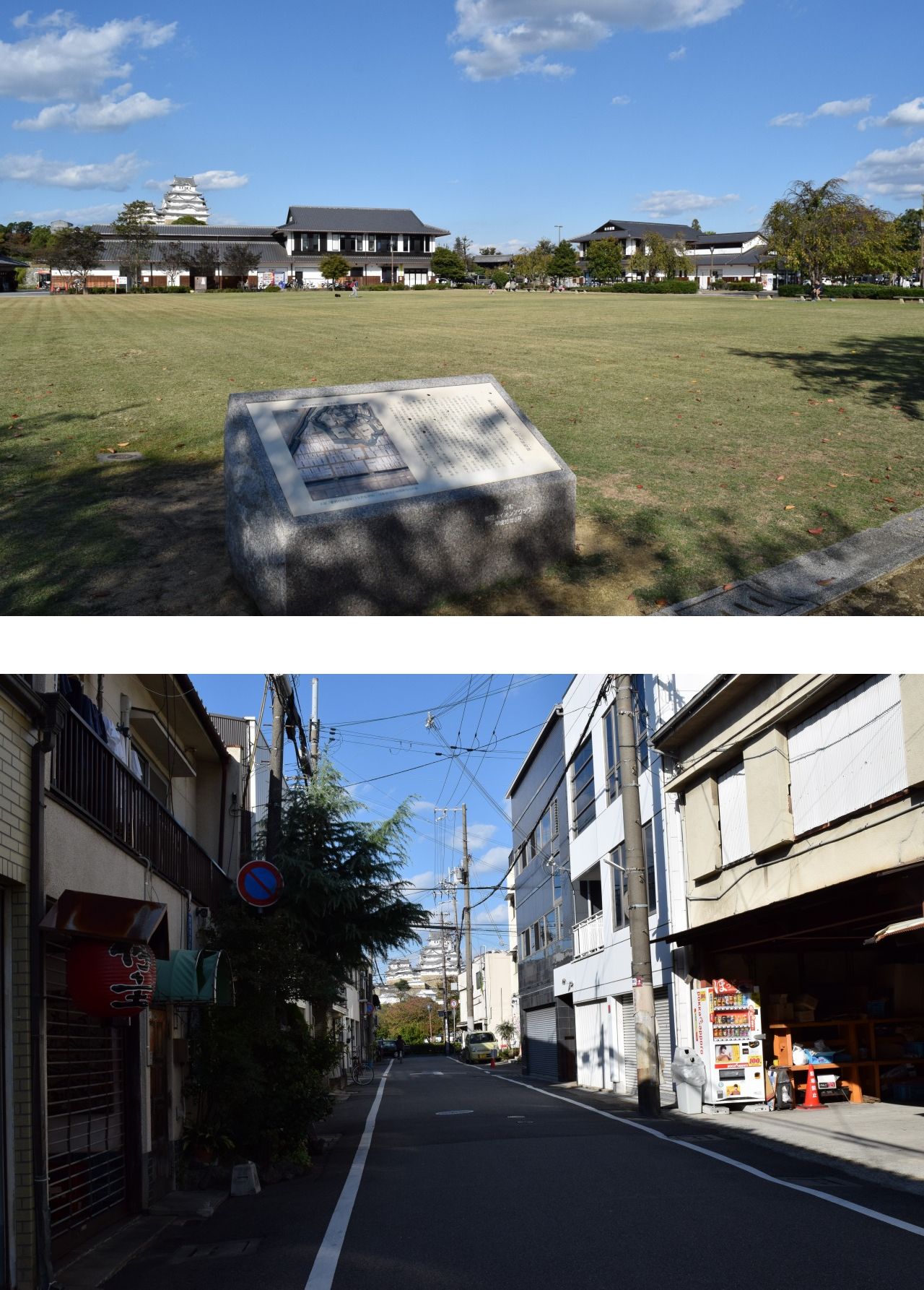 最後に向かったのは姫路城を目前に望む家老屋敷跡公園。観光客相手の飲食店、土産物店が立ち並ぶ一角だが、ここは甲子の獄で勤王志士を処刑した姫路藩佐幕派のリーダーだった高須隼人(広正)の屋敷跡。高須家は代々隼人を名乗った筆頭家老職の家柄で、屋敷は大手門に向かう中ノ門筋と大名町の通りが交差する角地にあり、東西約135m、南北約75mという広大なもの。今は姫路城のビューポイントとして知られるが、映像的にはその南側一帯の昭和レトロ感満載の町並みの方に心惹かれるものがある。