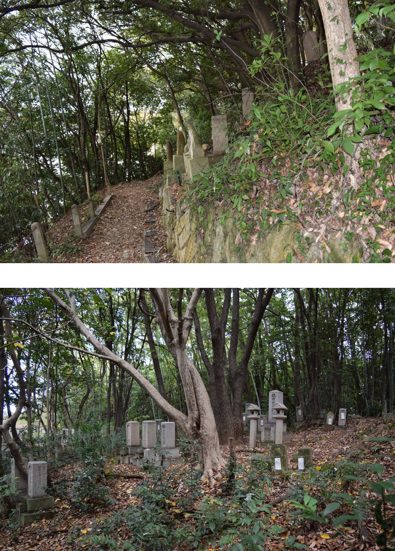 とりわけそれを象徴するのが墓地のほぼ中央にある、寛保元年から寛延元年まで(1741〓1748)姫路藩主を務めた松平明矩の墓所で、土塀や門、灯籠などは倒壊。それらの残骸がそこかしこに打ち捨てられており、書写山円教寺や増位山随願寺に残る歴代藩主の墓所に比べても荒みようが甚だしい。