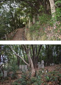 本堂の裏手の山が景福寺山で、山の南面が墓地になって広がっている。もちろん、新しい墓碑もあるにはあるが、目を引くのが文化、文政、嘉永など、江戸時代後期の元号が刻まれた古い墓碑。その多くが旧姫路藩士の墓で、有志らから成る景福寺山史跡保存会の手で墓碑の調査や整備が行われているが、明治維新後、藩士らの多くが東京に移り住み、無縁仏になったためか、雑草や落ち葉に埋もれかけている墓碑も少なくない。逆にそれが江戸期の墓地としてリアリティを持って迫ってくるので、映像的にはかえって魅力を深めている。