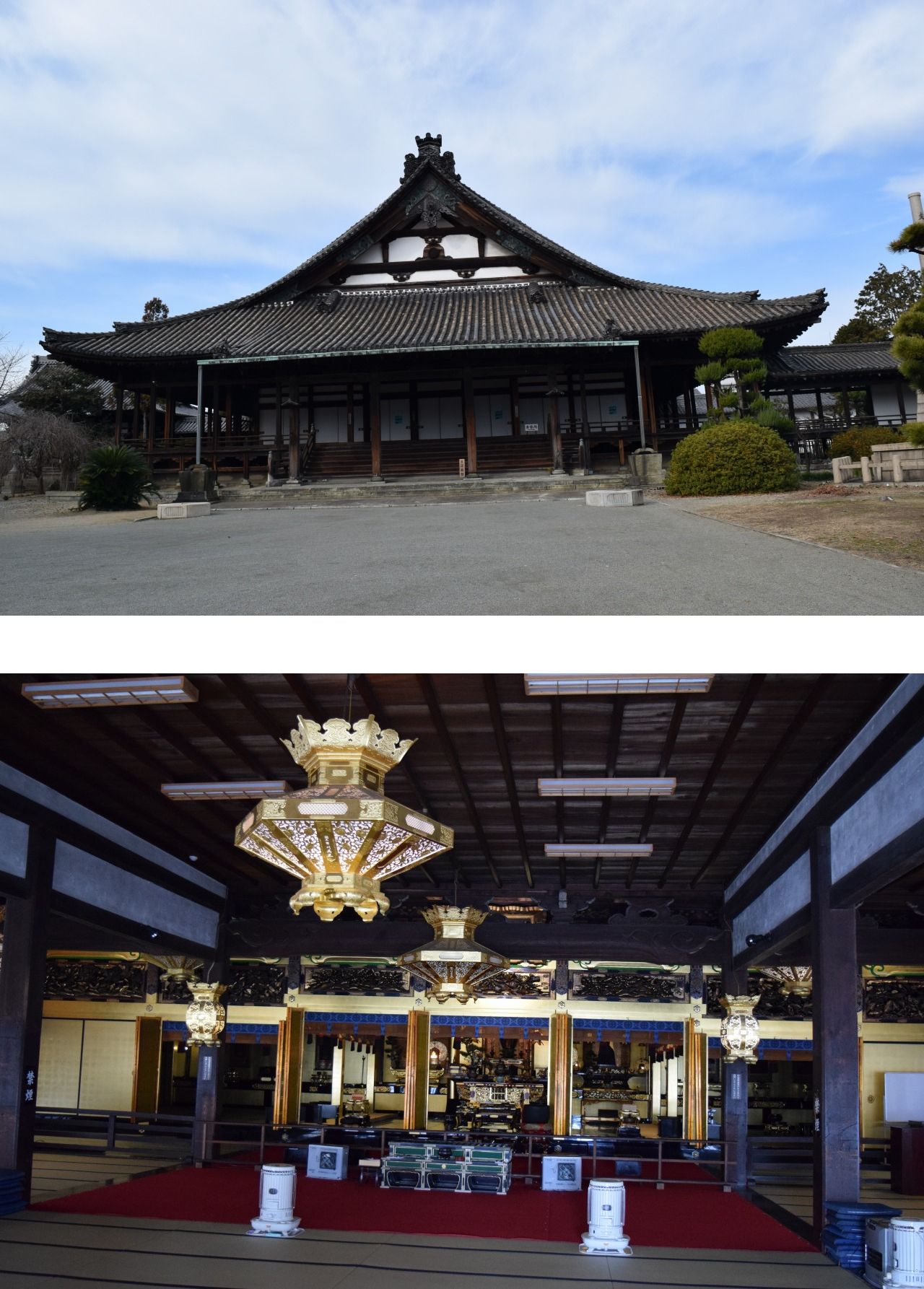 本堂は桁行19間(約34m)、梁間15間(約27m)の県下最大の仏堂で、内陣は左右に余間を控え、外陣には200畳の畳が敷かれ、三方に廊下のように見える広縁と落縁を巡らせている。その北側の柱には新選組の隊士が付けた刀傷が残っているが、あるいは彼らの明日知れぬ身の鬱憤がもたらしたのかもしれない。