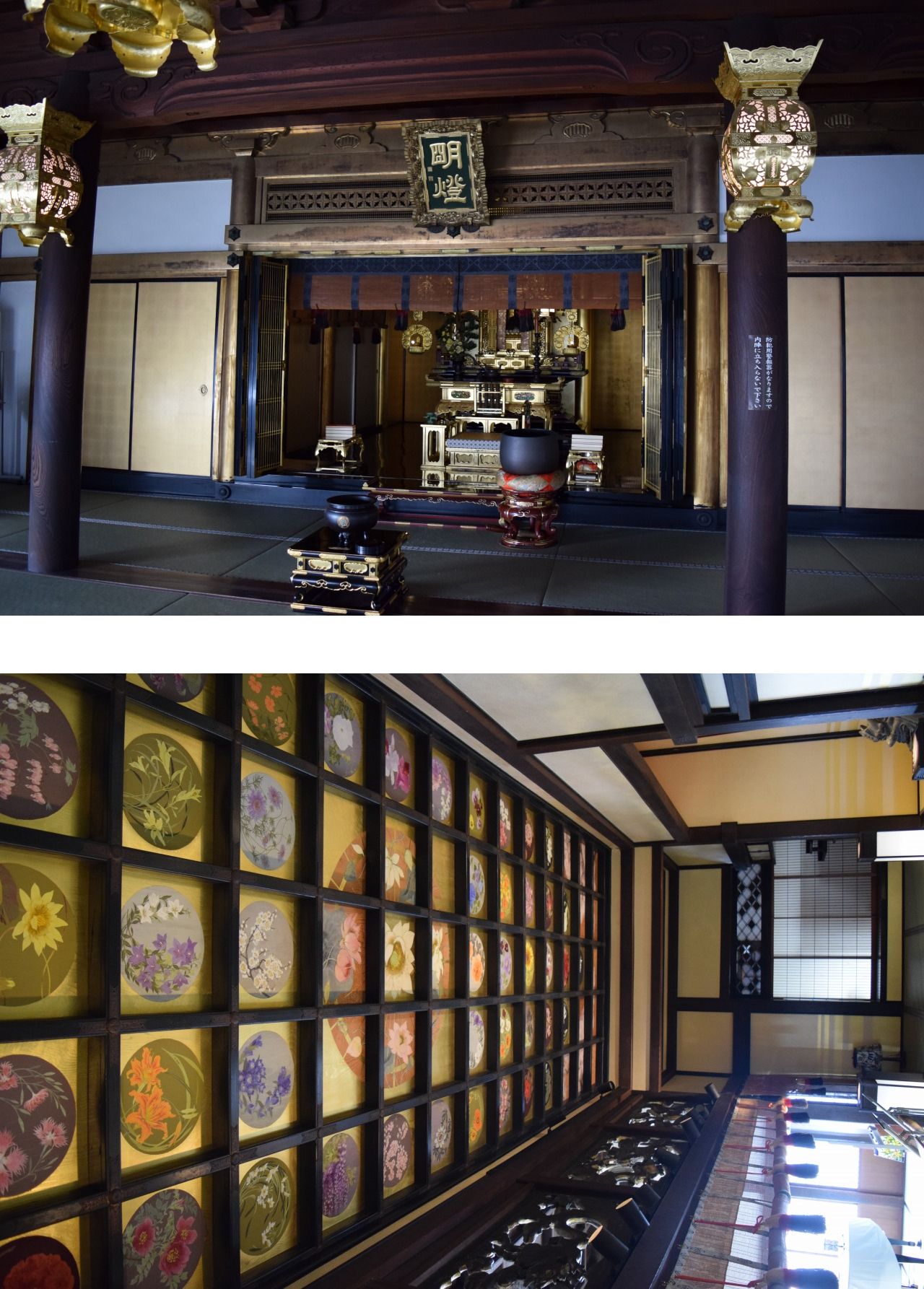 大広間の後部に建つ表書院も味わいがある。襖で4室に仕切られ、奥に上段の間、上上段の間があるのだが、襖を開け放って進んで行くと思いもかけない奥行きが生まれ、思わず感嘆の声が漏れる。隣接する畳敷きの廊下にも趣があり、歪みのあるレトロなガラス窓から本堂や庭園を眺める構図には、時代物に捉われない面白さがあるだろう。