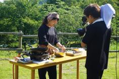 石倉峰相の里に移動して自然豊かなロケーションを背に、達人が「夢王」を贅沢に使って料理した玉子焼きやカルボーラーナを宮川さんとトムブラウンさんが試食。