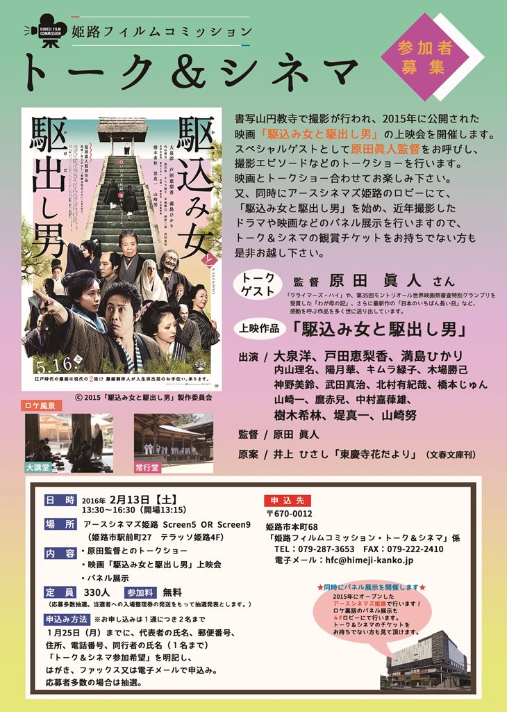 2015年5月に公開された映画「駆込み女と駆出し男」は、姫路の書写山圓教寺でメインロケが行われた作品で、姫路からも約40名の女性エキストラが参加しました。今回、映画監督の原田眞人さんのトークショーと映画の上映会の参加者を募集します。【トーク&シネマ参加者募集】
