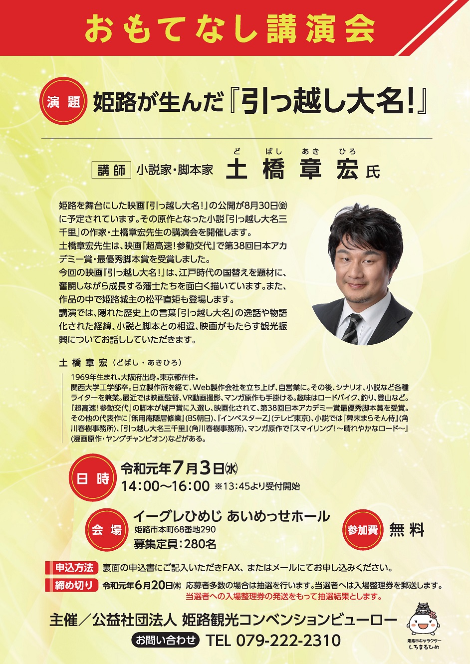 (公社)姫路観光コンベンションビューローでは、毎年、おもてなし事業の一環として、有識者をお招きして講演会を開催しています。今回は姫路を舞台にした映画『引っ越し大名!』が8月30日(金)に公開されます。