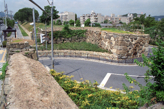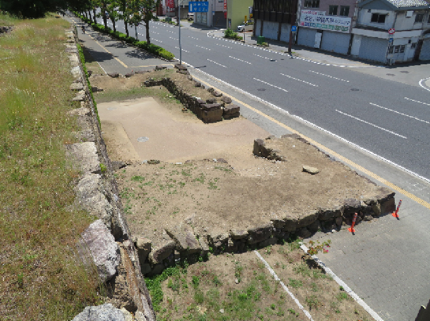 現状では、まず大手前通りと国道の交差点のすぐ西側に残っているのが中ノ門跡の石垣です。ここは城門がほとんど破壊されています。そこから国道沿いに西へ約300メートル進むと、鵰 (くまたか)門跡があります (写真1)。さらに西へ200メートル進むと埋 (うずめ)門跡があります (写真2)。いずれも建物は皆無ですが、枡形を構成した石垣が残っています。