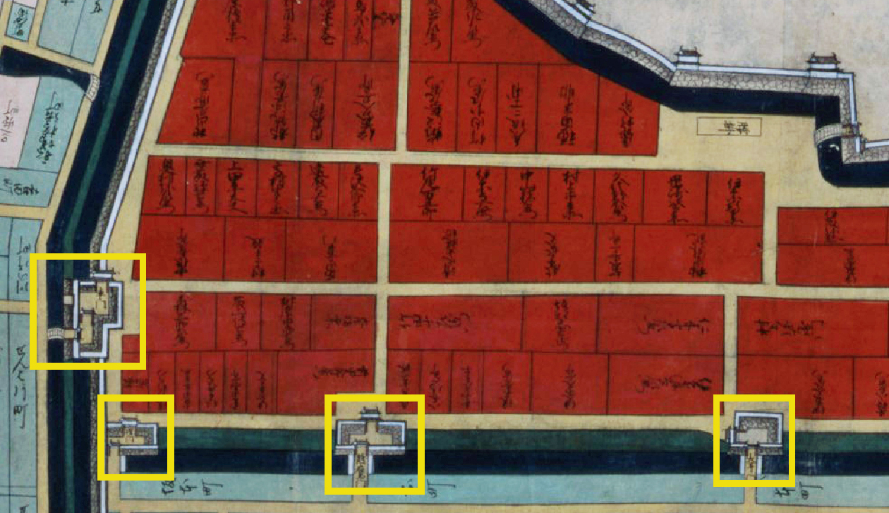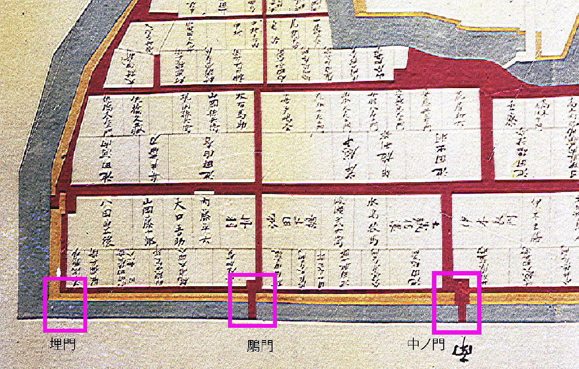 同じエリアを第一次榊原時代 (慶安2〈1649〉年~寛文7〈1667〉年)の絵図 (図2)で見てみましょう。中堀沿いに並んだ3つの城門はすべて石垣を採用した外枡形となっているのがわかります。