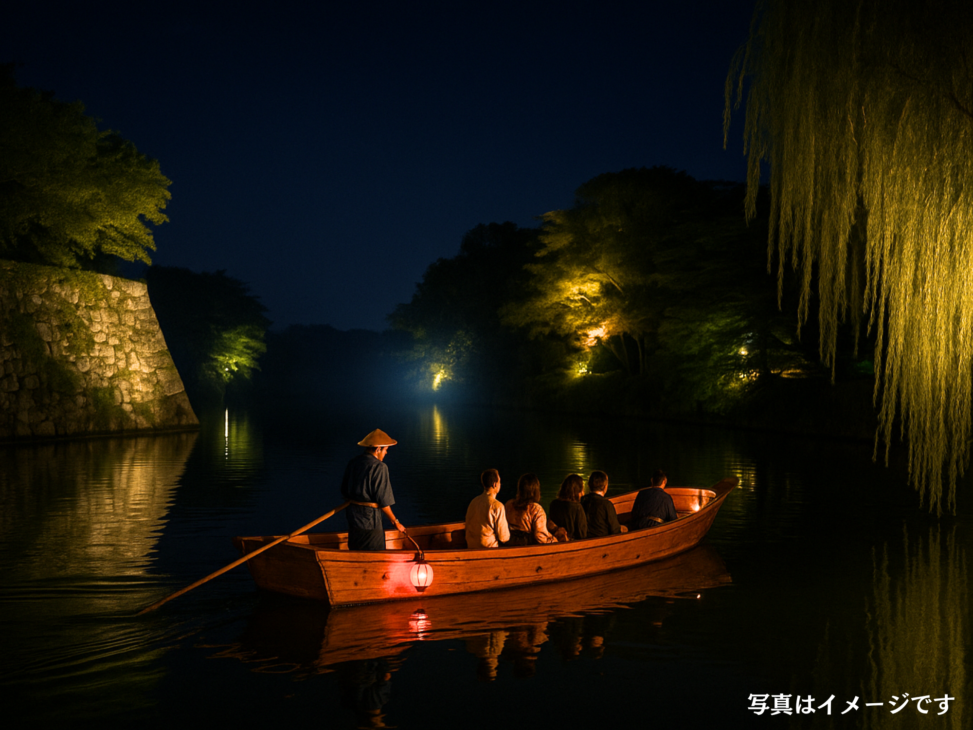 和提灯のあかりとともに、普段は立ち入ることのできない夜の城内とお堀をめぐります。