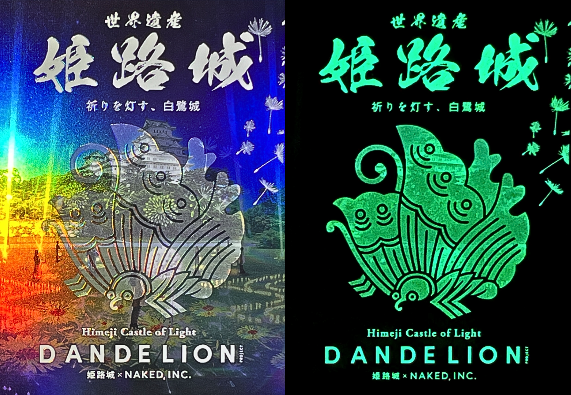 姫路観光コンベンションビューローでは、イベント限定の御城印を販売します。御城印は、「DANDELION」をイメージしたホログラムデザインに蓄光インクを用いることにより、明るい場所と暗い場所で二種類のデザインを楽しんでいただける、特別仕様の御城印となります。蓄光デザインには、姫路城主の池田氏の揚羽蝶紋(あげはちょうもん)が浮かび上がるデザインとなっています。販売は、イベント期間中(※11/22~12/11)に姫路城売店で1,000枚、イベント会場で2,000枚の計3,000枚限定を1枚700円(税込)で販売します。