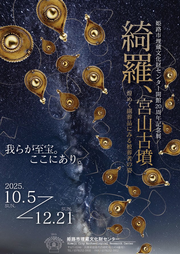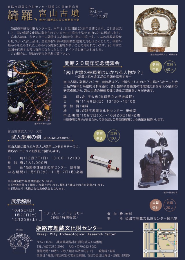 姫路市埋蔵文化財センターは、本年11月に開館20周年を迎えます。これを記念して、国の重要文化財に指定されている宮山古墳出土品を10年ぶりに展示します。宮山古墳は、姫路市埋蔵文化財センターに隣接する古墳時代中期の円墳です。3基の埋葬施設から見つかった出土品は、金垂飾付耳飾や銀錯貼金環頭大刀をはじめとして、朝鮮半島からもたらされたとみられる貴重な遺物が多いことで知られています。20年前には国に代表する考古資料のひとつとして、ドイツでも展示されました。この機会に、姫路の至宝をぜひご覧ください。皆さんのご来館をお待ちしています。