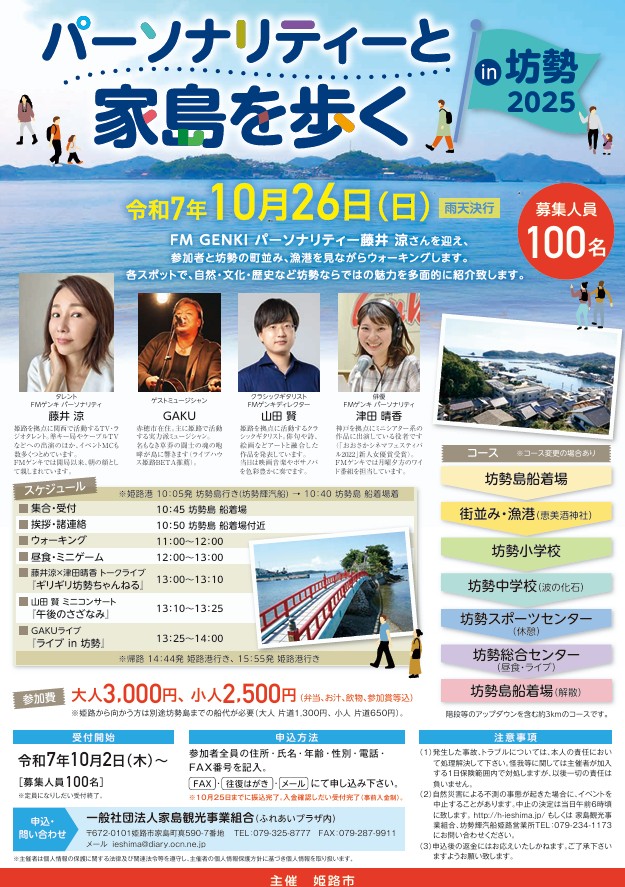 ・荒天や不測の事態が起きた場合にイベントを中止することがあります。中止の決定は当日6:00に一般社団法人家島観光事業組合公式サイトにて発表いたします。