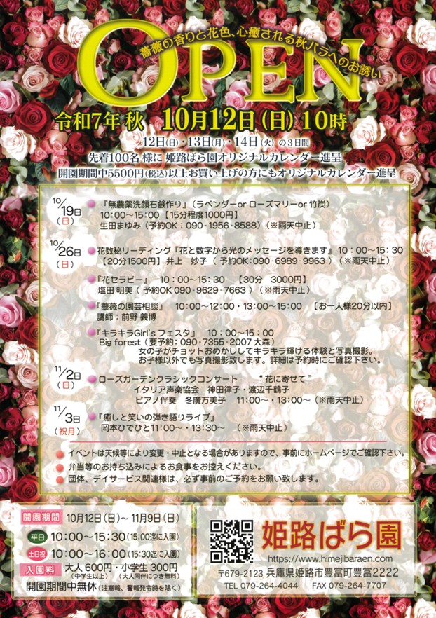 - 開催場所:姫路ばら園 (姫路市豊富町豊富2222)
