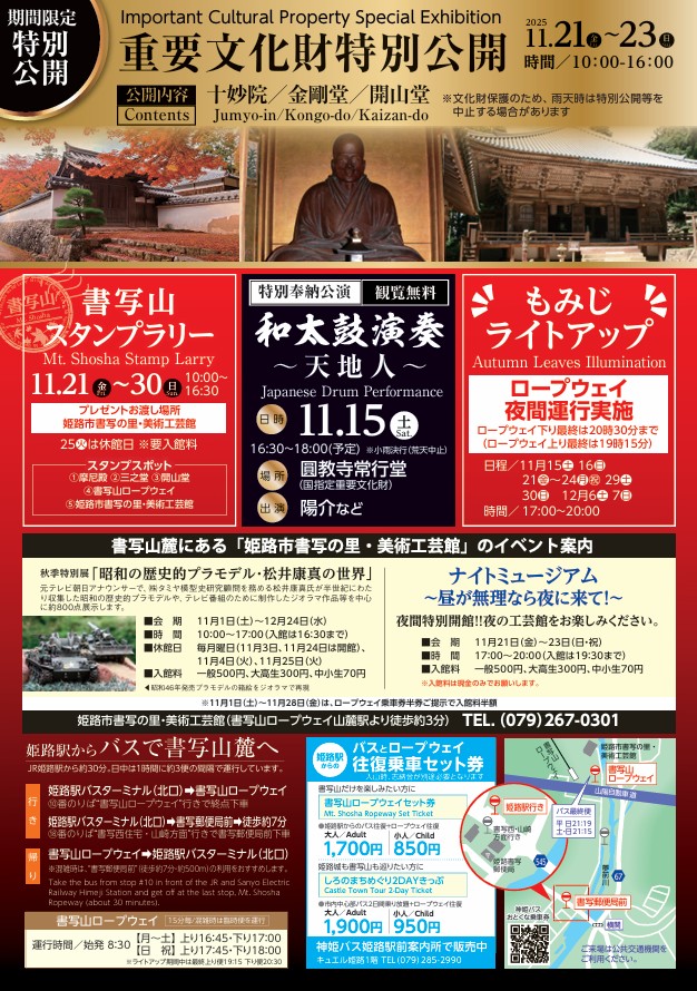 紅葉の名所である書写山で「書写山もみじまつり」が開催されます。通常非公開の重要文化財の特別公開を行うほか、夜間に紅葉ライトアップを行います。色鮮やかに染まる山野景観や普段見ることのできない重要文化財、ライトアップで幻想的な雰囲気へと変わる景色をぜひお楽しみください。