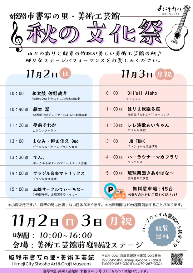 芸術の秋・紅葉の秋、書写山の麓の姫路市書写の里・美術工芸館の前庭でさまざまななステージパフォーマンスは披露されます。どなたでも無料でご覧いただけます。どなたでも無料でご覧いただけます。