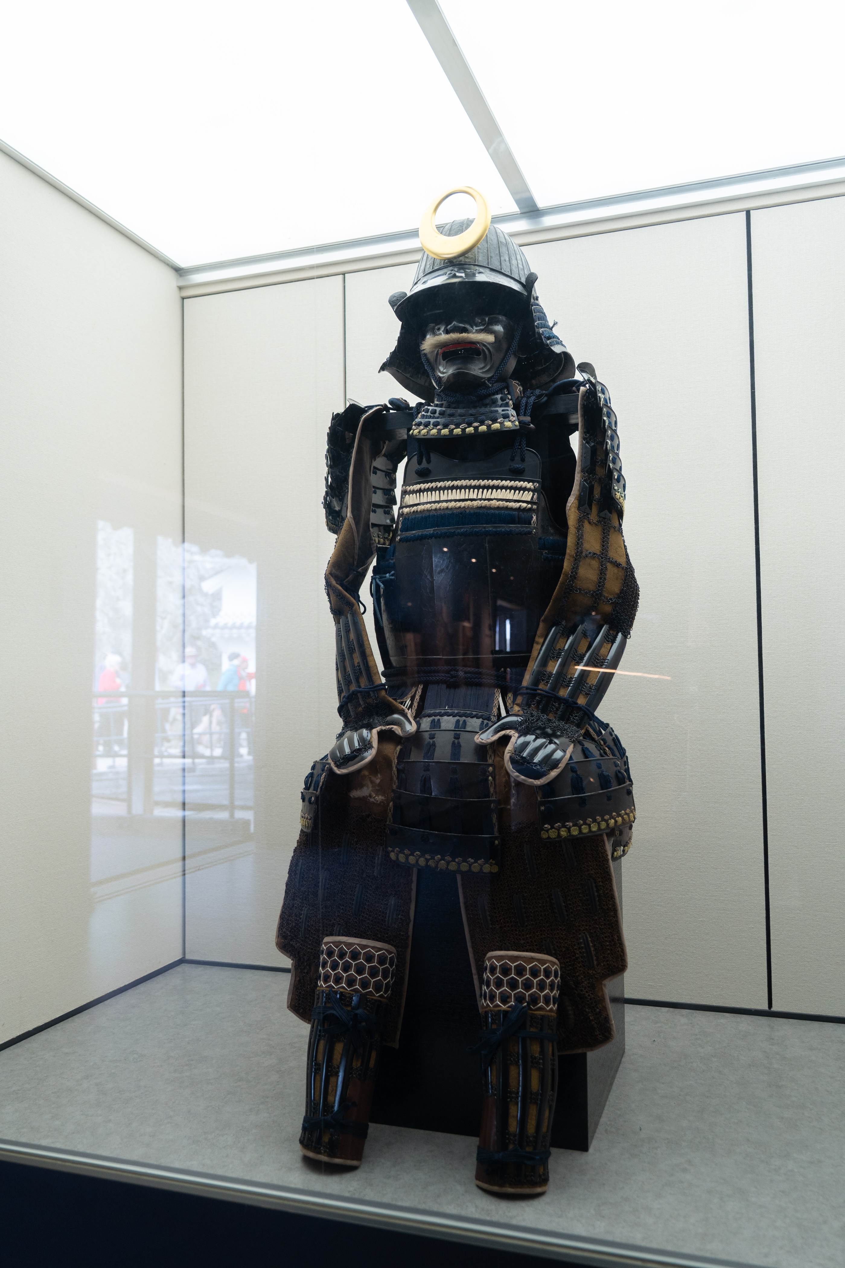 1. 鉄黒漆塗紺糸素懸威最上胴具足、鉄黒漆塗十六間大円山形筋兜、面頬、臑当