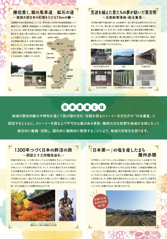 播磨地域には、4つの日本遺産があります。「播但貫く、銀の馬車道 鉱石の道~資源大国日本の記憶をたどる73㎞の轍~」、「荒波を越えた男たちの夢が紡いだ異空間~北前船寄港地・船主集落~」、「1300年つづく日本の終活の旅~西国三十三所観音巡礼~」、「『日本第一』の塩を産したまち 播州赤穂」。この度、その魅力を広く知っていただくため、赤穂市・高砂市・加西市・たつの市の協力のもと、日本遺産の構成文化財のパネル展示等を行います。ぜひ、足をお運びください。