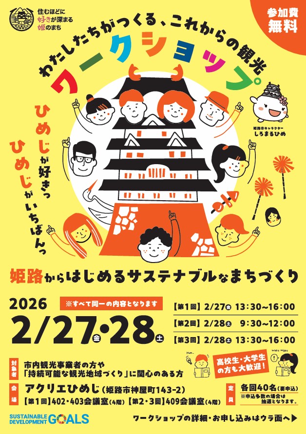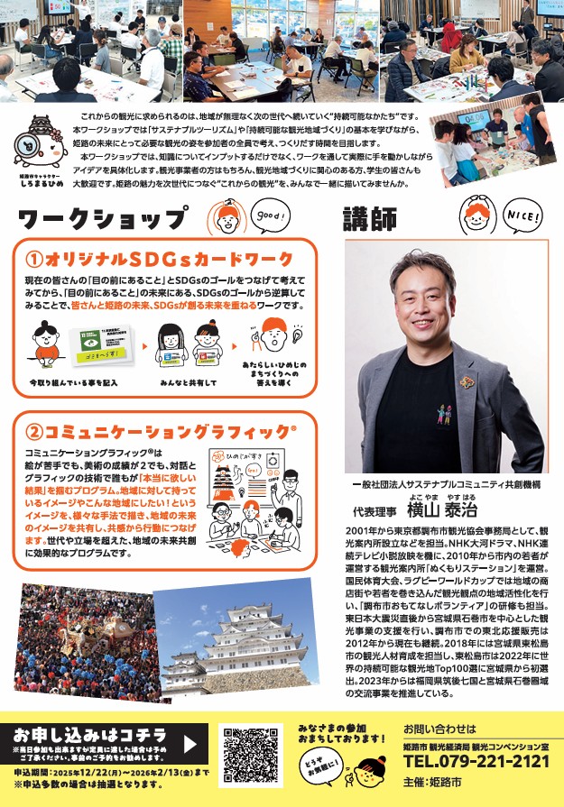 これからの観光に求められるものは、地域が無理なく次の世代へ続いていく「持続可能なかたち」です。今回は「サステナブルツーリズム」や「持続可能な観光地域づくり」の基本を学びながら、姫路の未来にとって必要な観光の姿を参加者の全員で考え、つくりだす時間を目指します。