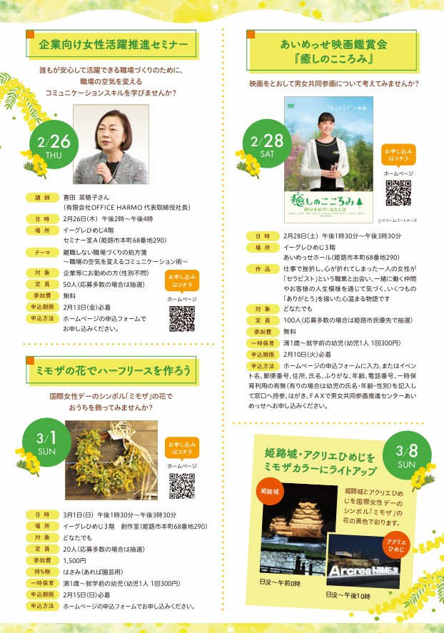 姫路市でも国際女性デーに関連したイベントを開催。そのうちの一つとして、国際女性デー当日の夜に姫路城とアクリエひめじを国際女性デーのシンボル「ミモザ」の花の黄色で彩ります。