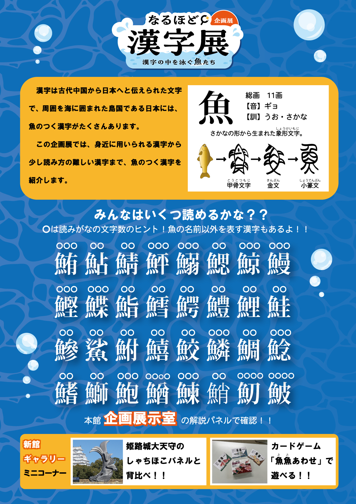 姫路城大天守の「しゃちほこパネル」設置や魚偏のつく漢字一覧表を展示します。
