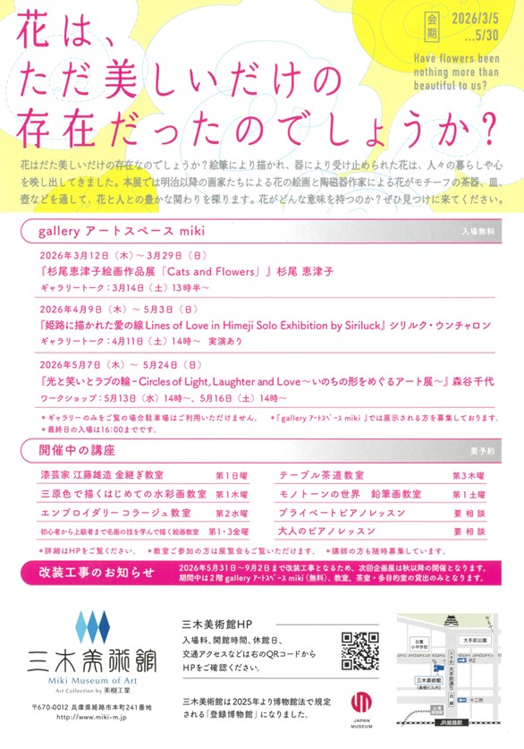 ※2026年5月31日~9月2日まで改装工事となるため、次回企画展は秋以降の開催となります。期間中は2階 galleryアートスペース miki (無料)、教室、茶室・多目的室の貸出のみとなります。
