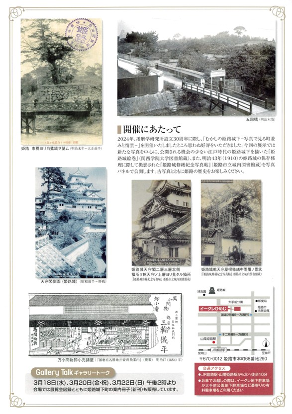 2024年、播磨学研究所設立30周年に際し、「むかしの姫路城下-写真で見る町並みと情景-」を開催いたしましたところ、思わぬ好評をいただきました。今回の展示では新たな写真を中心に、公開される機会の少ない江戸時代の姫路城下を描いた『姫路城絵巻』(関西学院大学図書館所蔵)、また、明治43(1910)年の姫路城の保存修理に際して撮影された『姫路城修繕記念写真帖』(姫路市立城内図書館蔵)を写真パネルで公開します。古写真とともに姫路の歴史をお楽しみください。