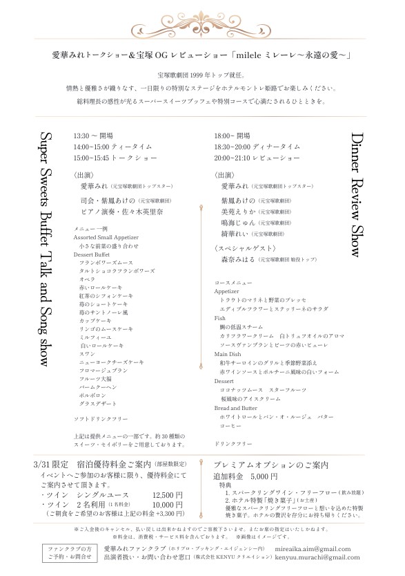 ・愛華みれファンクラブの方は (mireaika.aim@gmail.com)にお問合せください。