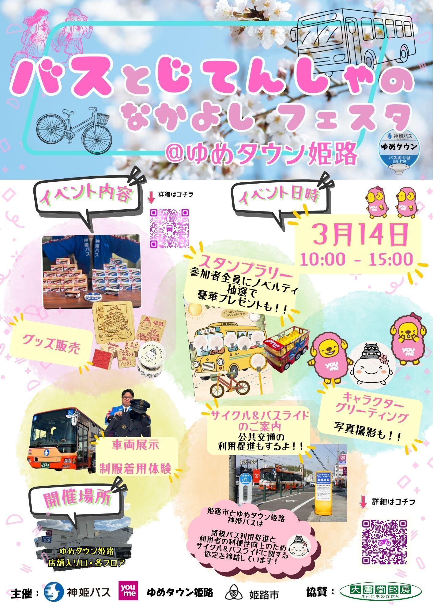 ゆめタウン姫路の駐輪場でのサイクル&バスライド設置を記念して、ゆめタウンと神姫バス、姫路市が合同で、公共交通利用促進イベントを初開催します。当日は参加費無料で、どなたでもお越しいただけます。